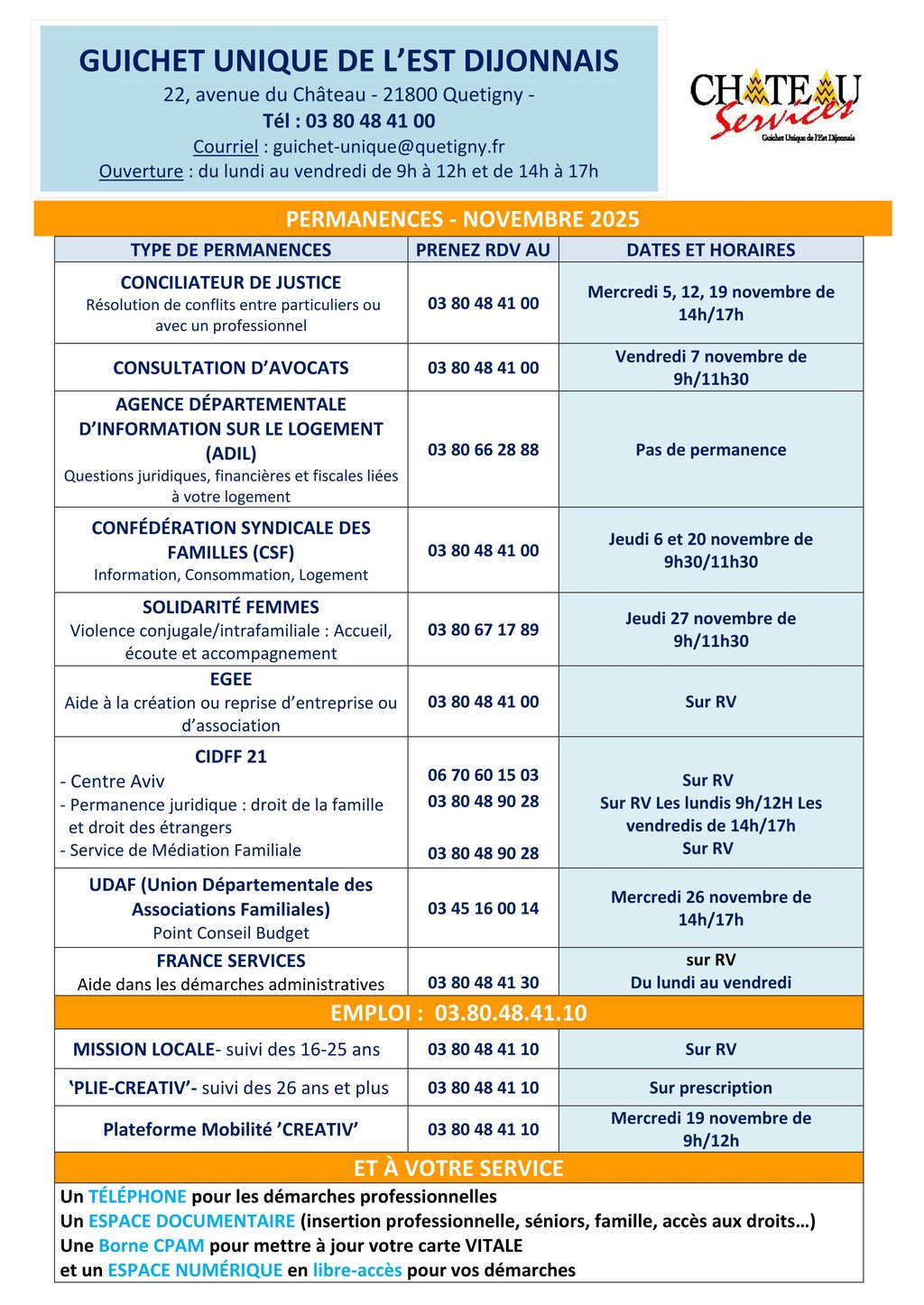 TABLEAU DES PERMANENCES DU GUICHET UNIQUE DE L'EST DIJONNAIS : NOVEMBRE 2025