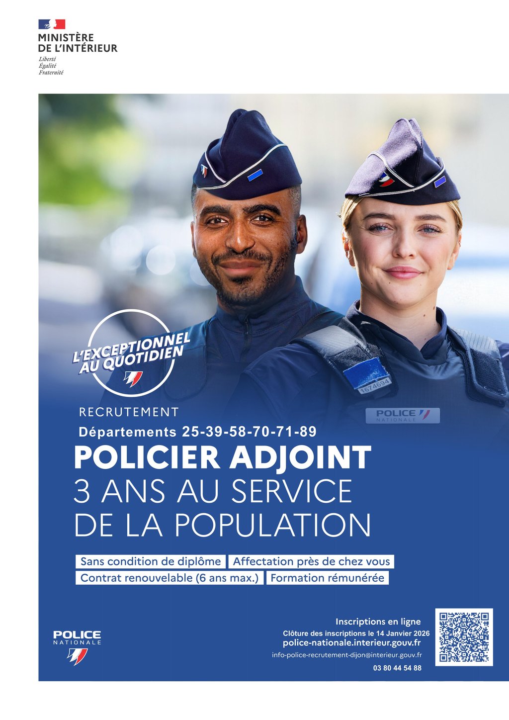 Nous vous informons des ouvertures des concours de Policiers Adjoints de la Police Nationale dans les départements 25, 39, 58, 70, 71 et 89 de la Bourgogne Franche-Comté !