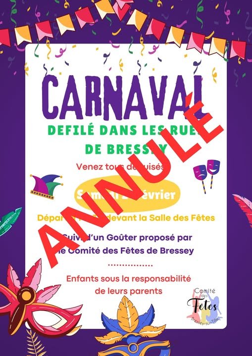 Rendez-vous le Samedi 21 février à 14h30 devant la salle des fêtes, déguisés, pour débuter un défilé dans les rues de notre village.