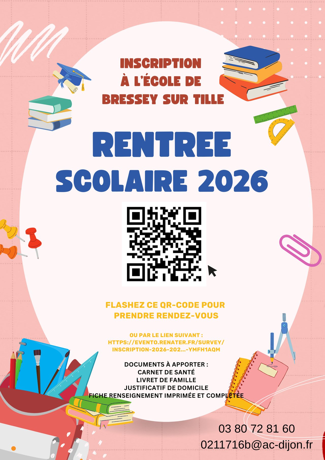 Vous souhaitez inscrire votre enfant à l'école de Bressey sur Tille pour la rentrée 2026-2027, merci de vous inscrire sur un des créneaux proposés.