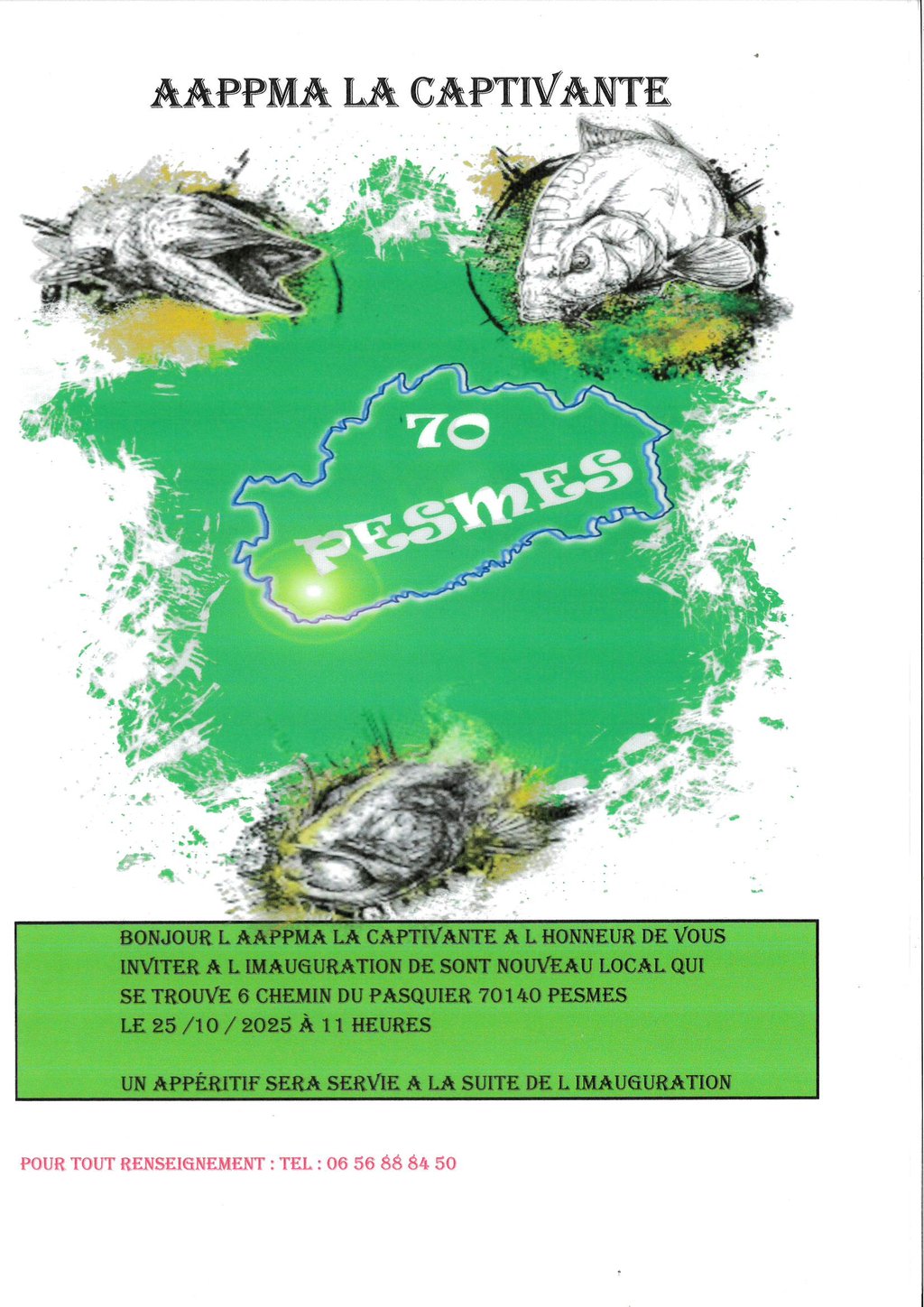 L'AAPPMA La Captivante a l'honneur de vous inviter à l’inauguration de son nouveau local 6 chemin du Pasquier le 25 octobre à 11 heures.