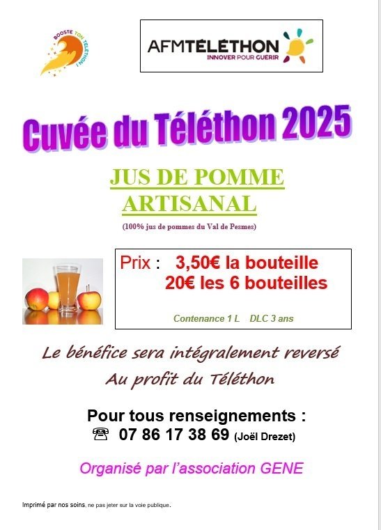 C'est une bonne année à pommes, le jus sera très bon et nous devrions en avoir en quantité, alors je compte particulièrement sur votre soutien pour réussir cette opération qui fait gagner beaucoup d'argent au Téléthon.