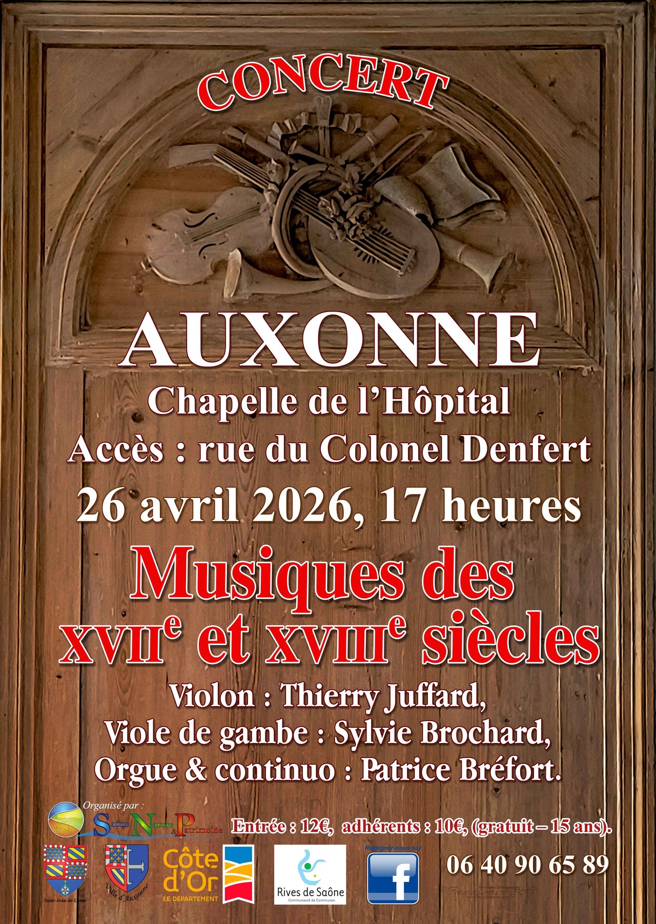 Concert de musiques des XVIIe et XVIIIe siècles, avec Thierry Juffard violon, Sylvie Brochard viole de gambe, et Patrice Bréfort orgue et continuo.